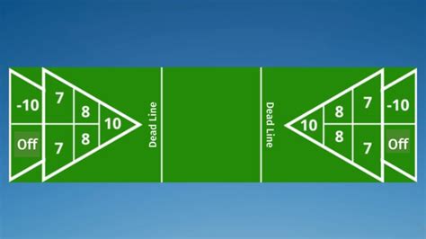 In doubles, partners shall play on the same color at both ends of the court. Each side has a scoring triangle. Each triangle has scoring zones with ten at the top, then 8, 7, and then the 10.